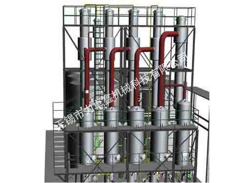 工作原理:四效降膜蒸發(fā)器需濃縮的料液由泵送入加熱管頂部,沿著加熱管內壁形成液膜向下流動。在這個過程中,由于管外的加熱,管內液膜開始沸騰并部分蒸發(fā)